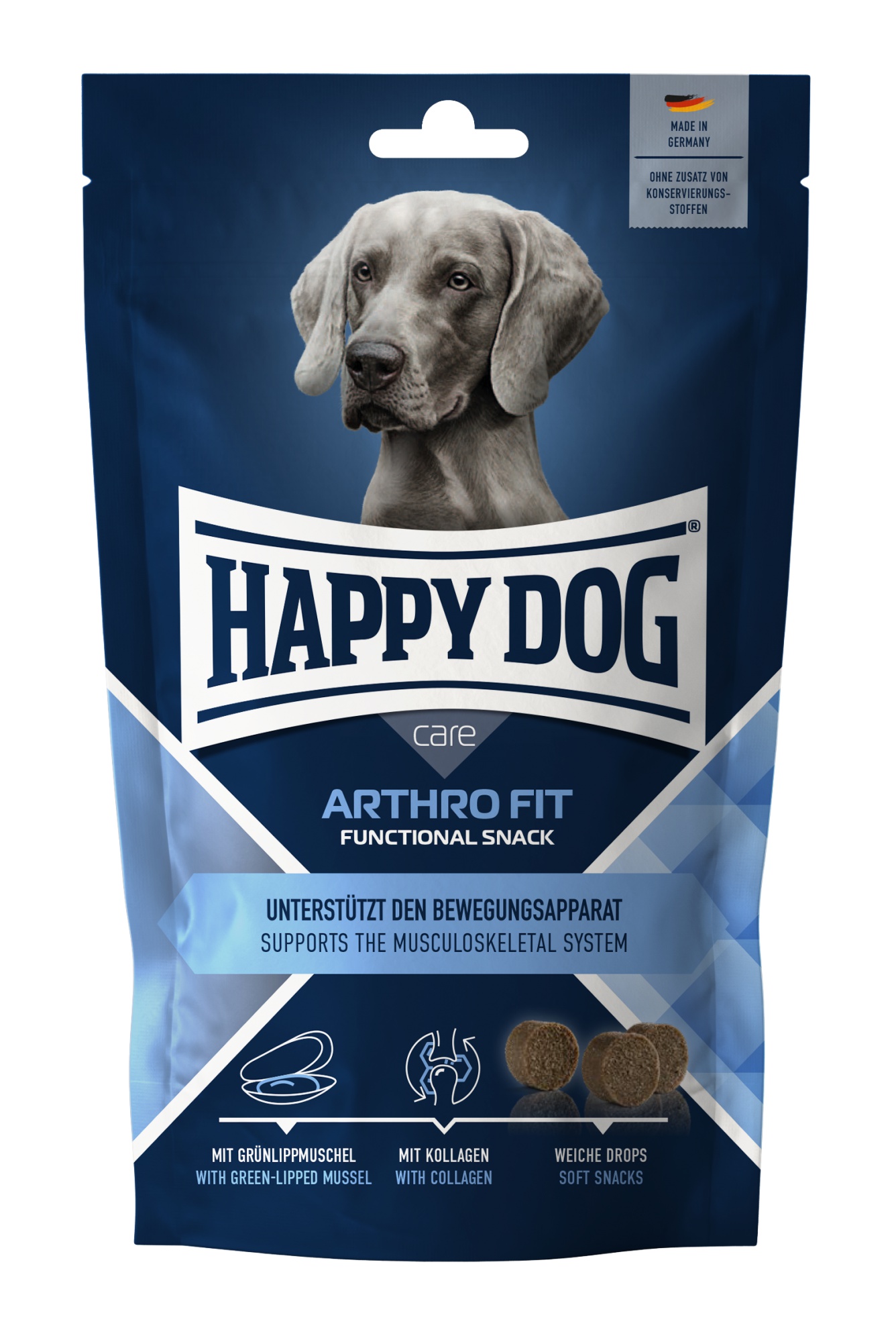 Négylábú barátaink ízületei minden nap stressznek vannak kitéve: játék, tombolás és edzés közben. A Happy Dog Care Snack Arthro Fit az ízületek természetes működésének támogatására lett kifejlesztve. Ezek a falatkák nemcsak különösen ízletesek, hanem az értékes zöldajkú kagyló és kollagén-hidrolizátum révén további támogatást nyújtanak a mozgásszerveknek. A funkcionális rágcsálnivaló puha korongjai könnyen kéznél lehetnek és tökéletesen adagolhatók. A jutalomfalatok Németországban készülnek, természetesen hozzáadott cukor nélkül, valamint mesterséges aroma, színezék és tartósítószer nélkül.
