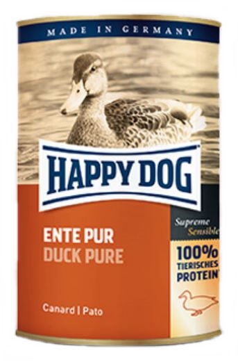 A Happy Dog Ente Pur nedves kutyatáp kizárólag frissen vágott őshonos kacsából származó hús felhasználásával készül, és nem tartalmaz szóját, növényi adalékokat, színezéket és tartósítószert.