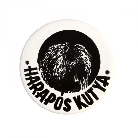 Ez a 10 cm átmérőjű, zománcozott fém tábla tökéletes választás, ha stílusosan szeretnéd jelezni a kutyád jelenlétét. A retro stílusú tábla több féle grafikával kapható, így biztosan találsz olyat, ami illik a házadhoz és a kutyádhoz.