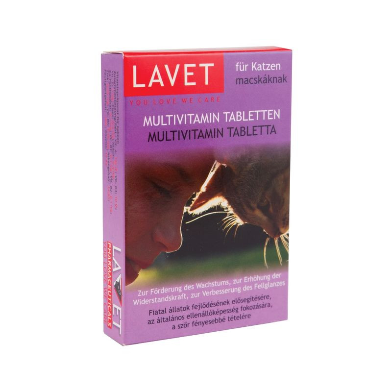 Javallat: Lavet Multivitamin tabletta macskáknak – Általános ellenállóképesség fokozására, fiatal cicák fejlődésének elősegítésére, a kifejlett macskák közérzetének javítására, stresszhelyzetekben (kiállítás, utazás stb.) a terhelhetőség növelésére, betegségek utáni felépülés gyorsítására kifejlesztett készítmény.A Multivitamin életfontosságú vitaminjai, mikroelemei és a készítményben található nagyértékű élesztőfehérje elősegíti a fiatal állatok fejlődését, fokozza a betegségekkel szembeni ellenállóképességet, a vitalitást valamint a szőr fényességét. Így ideális étrendkiegészítője minden fajtájú és korú macskának.Beltartalom tablettánként:Nyersfehérje 16,6 %, nyerszsír 0,4 %, A-vitamin 100 NE, D3-vitamin 10 NE, E-vitamin 0,5 NE, B1-vitamin 106 µg, B2-vitamin 108 µg, Ca-D-pantotenát 118 µg, B6-vitamin 53 µg, niacin 428 µg, biotin 5 µg, folsav 6 µg, vas 0,5 mg, réz 17 µg, cink 65 µg