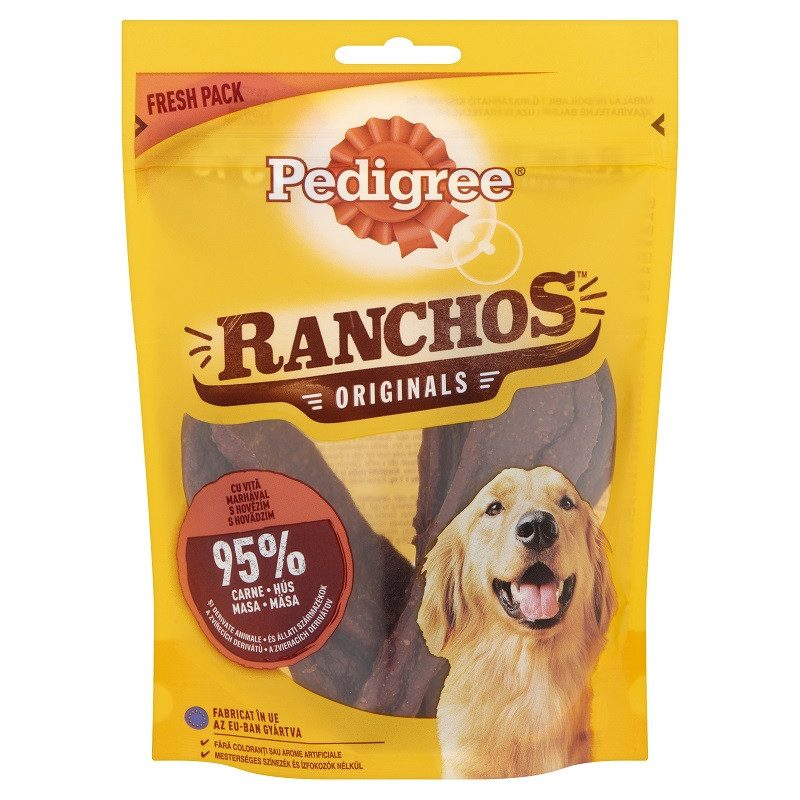 A Pedigree Ranchos Marhával snack 95% hússal és állati melléktermékkel készült puha jutalomfalat. Gondosan szárított, igazán ízletes és finom illatú.