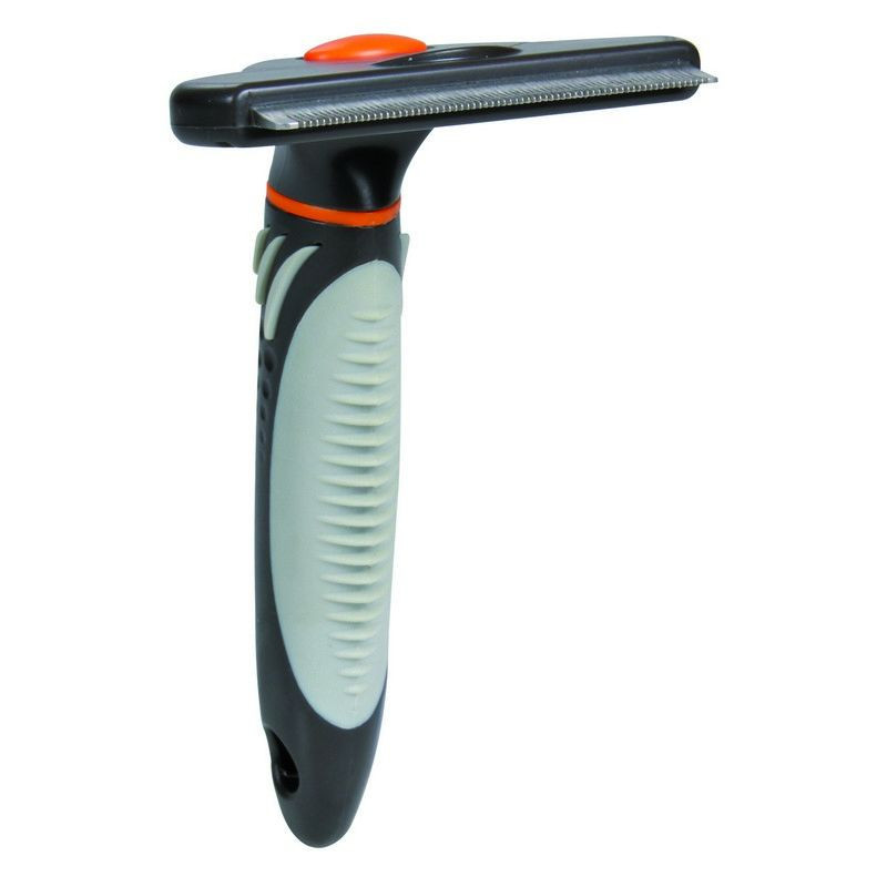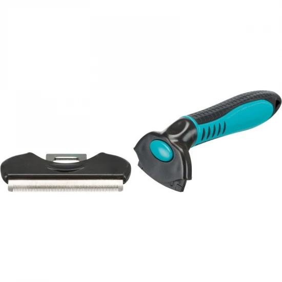 Cserélhető fejű fésű. Méret: 8x14cm. Használatával könnyedén eltávolítható az elhalt szőrzet. A kefe rozsdamentes acél pengéje egyszerűen cserélhető. A fogantyú műanyag, csúszásmentes gumi markolattal. Lovak szőrén is használható.