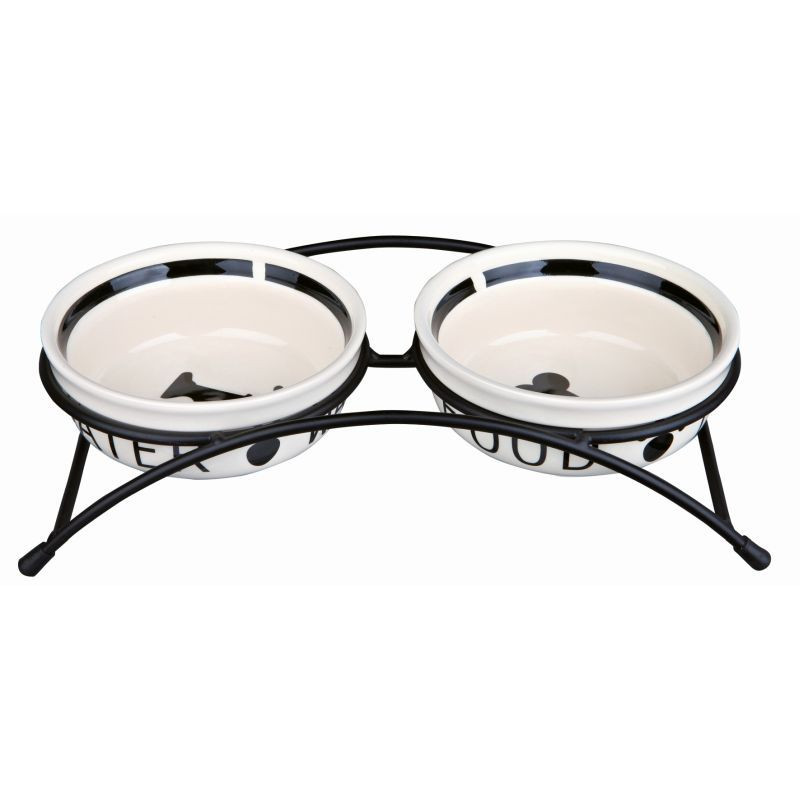 A Trixie kerámia szett előnye, hogy kedvencének nem kell túlságosan lehajolni az ételért, így még élvezetesebb lehet az étkezés. A porfestett állvány végein csúszásgátló gumi került elhelyezésre, ezért az állványt nehéz eltolni, vagy felborítani. A nagy űrtartalmú fehér kerámia tálak modern design-t kaptak. Feliratokkal és motívumokkal díszített. A tálak kézzel és mosogató gépben is tisztíthatóak. A tálak mérete: 15cm Űrtartalma: 2×1,6L Színe: Fekete-fehér